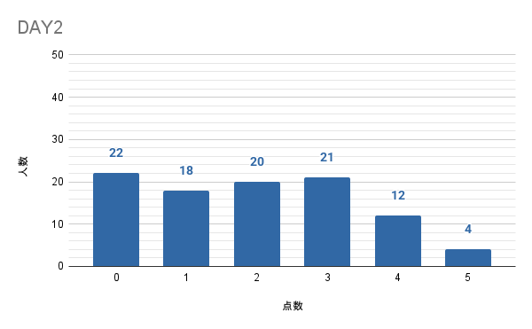 前夜祭の時点で「難易度が高すぎる」とフィードバックをいただき、調整したはずの DAY1 でも0〜1点の方が半数以上、という結果に……。さらに調整した DAY-2 ではそこそこの難易度になったものの、ブースにお越しくださった多くの PHPer の皆さんを楽しませるつもりが、悩ませる結果になってしまいました。